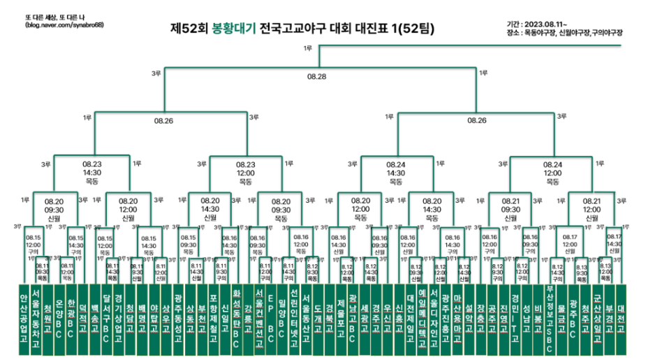 일시: 2024년 8월 11일(일)~8월 30일(금) / 20일간(우천 시 순연)장소: 서울 목동·신월·구의 구장홈페이지: bonghwang.hankookilbo.com(봉황대기 전국고교야구대회)