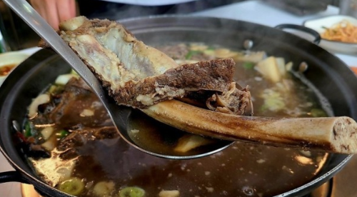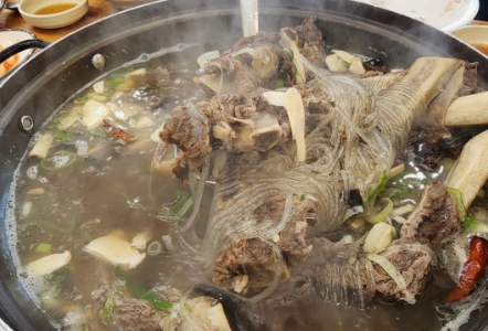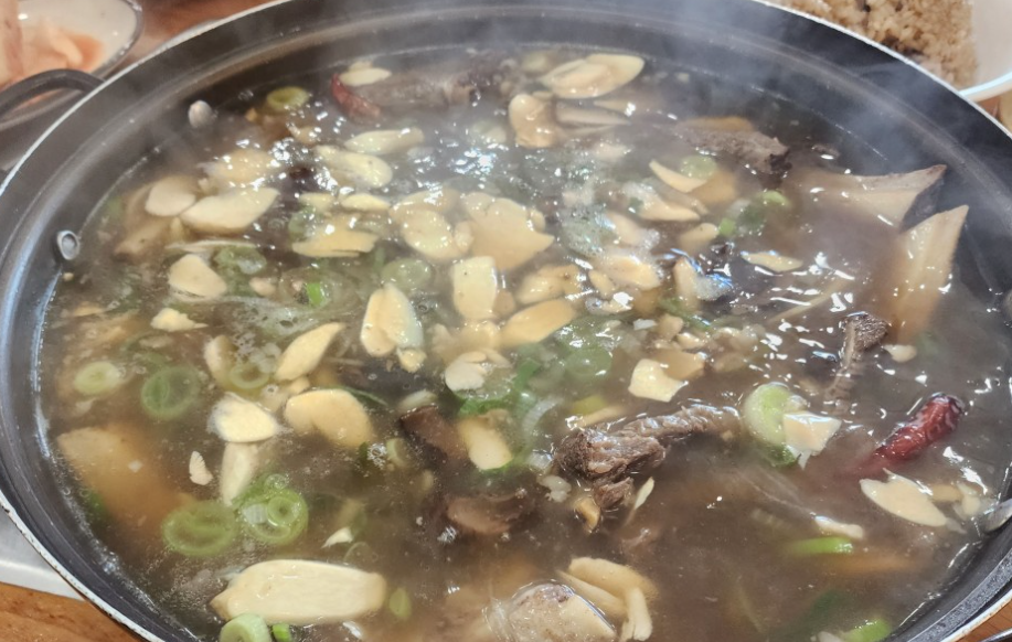 대개 능이는 백숙으로 조리하지만, 일능이약사는 갈비찜으로 내놓습니다. 이 갈비찜에는 낙지와 전복까지 넣어 ‘용궁갈비탕’이라 부르며, 도가니까지 추가하면 ‘옥황상제 갈비탕’이라는 이름이 붙습니다. 처음부터 능이를 추가 주문하는 것이 좋습니다.