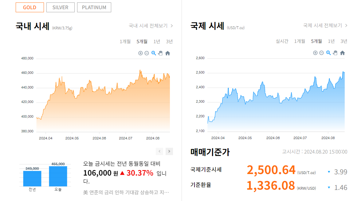 국제 금 가격이 연일 상승하면서 트로이온스(Troy-Ounce, 이하 온스)당 2,500달러를 넘어서며 금괴 1개의 가격이 사상 처음으로 100만 달러를 초과했습니다. 국제 금 가격은 전 거래일 대비 0.13% 상승한 온스당 2,541.3달러에 거래를 마쳤습니다. 오늘의 금시세 1돈가격 한돈 금값 18k 아래를 통해서 조회하시기 바랍니다