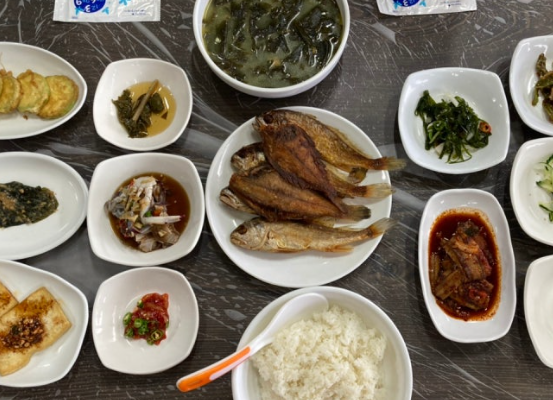 저녁 식사는 하루를 마무리하며 또 한 번의 미식 경험을 선사합니다. 저녁 메뉴는 가자미 무조림과 아가미 튀김, 미역쌈, 그리고 세 가지 젓갈로 구성되어 있습니다. 가자미 무조림은 거제도 특산 가자미와 신선한 무를 사용해 깊은 맛을 내며, 아가미 튀김은 바삭하고 고소한 맛이 일품입니다. 미역쌈은 거제 앞바다에서 갓 수확한 미역을 사용해 신선하고 아삭한 식감을 느낄 수 있습니다. 여기에 세 가지 젓갈이 곁들여져, 저녁 식사는 그야말로 이수도에서의 하루를 완벽하게 마무리하는 데 제격입니다.