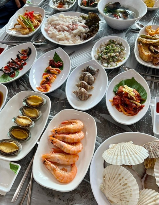 점심 시간에는 더욱 풍성한 거제 해산물 잔치가 펼쳐집니다. 이 민박집에서 제공하는 점심 메뉴는 신선한 회를 중심으로 소라, 전복, 새우, 멍게 등 다양한 해산물이 한 상 가득 차려집니다. 각 해산물은 각각의 고유한 맛과 식감을 가지고 있어, 하나하나 음미하며 먹는 즐거움이 큽니다. 특히, 도시총각을 위해 특별히 준비된 여름 제철 보리새우는 이수도에서만 맛볼 수 있는 별미로, 그 신선하고 달콤한 맛이 일품입니다. 식사 후에는 이수도의 아름다운 풍경을 감상하며 소화도 시킬 수 있어, 몸과 마음이 모두 만족스러운 시간이 됩니다.