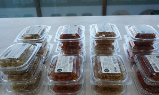 특히, 완성된 반찬을 포장하는 작업에서는 정확한 무게를 맞추는 것이 중요한데, 이 중에서도 라벨지 스티커를 부착하는 달인이 눈에 띕니다. 엄지손가락 스냅을 이용해 라벨지를 밀어주는 것이 달인의 진짜 기술이라고 합니다. 3년 동안 열심히 연마한 끝에 달인이 되었다고 합니다.
