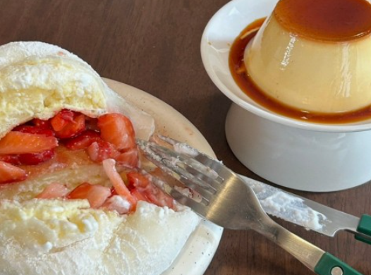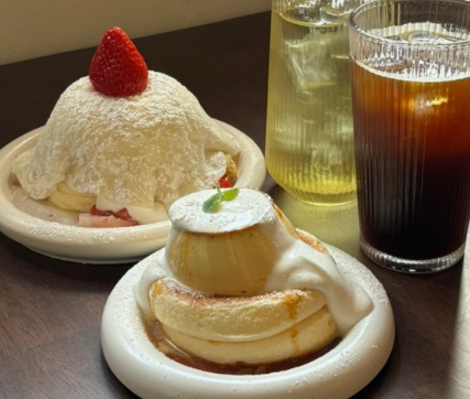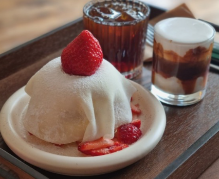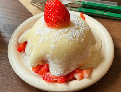 여기 대표 메뉴인 '딸기 모찌 수플레'는 부드럽고 폭신한 수플레 팬케이크 위에 쫀득한 모찌와 싱싱한 딸기가 어우러져 만들어집니다.