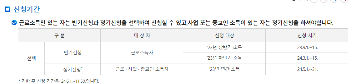 한편, 2024년 근로장려금 및 자녀장려금의 정기신청 기간은 5월 1일부터 31일까지입니다. 근로소득만 있는 자는 반기신청과 정기신청을 선택하여 신청할 수 있으며, 사업이나 종교인 소득이 있는 자는 정기신청만 가능합니다. 신청 방법의 서비스 이용 시간은 오전 6시부터 밤 24시까지입니다.
