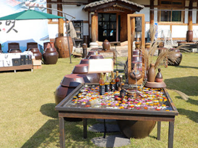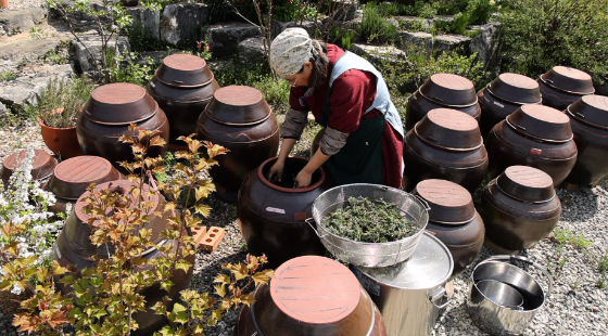 성수면에 위치한 한 마당에서 크고 작은 옹기들이 눈에 띕니다. 이 옹기들 안에는 콩, 과일 등으로 만든 자연 발효식초가 가득합니다.