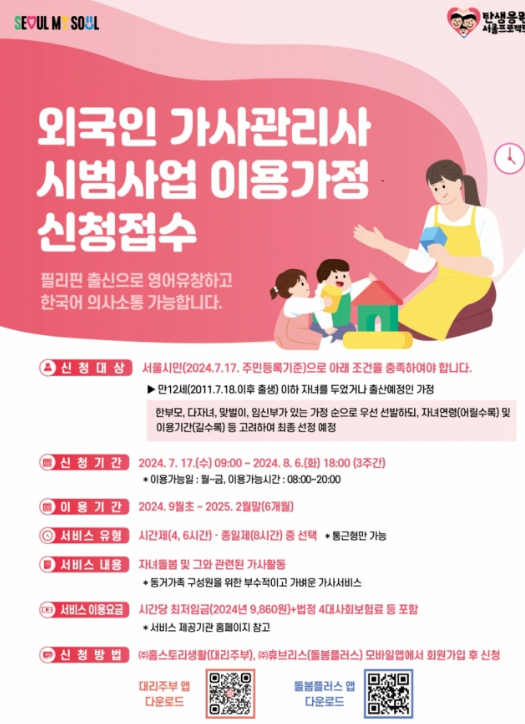 정부는 돌봄 서비스가 시급한 '한부모·다자녀·맞벌이·임산부' 가정 순으로 희망 가정을 우선 선발할 방침입니다. 서울시에 따르면 외국인 가사관리사 희망 가정 모집에는 신청 개시 열흘 만에 310가구가 신청하는 등 시민들의 관심을 받고 있는 것으로 전해졌습니다. 특히 가사관리사 신청을 위한 전용 앱 가입자 수는 2500명을 넘어서면서 초기 수요가 높은 상황입니다.