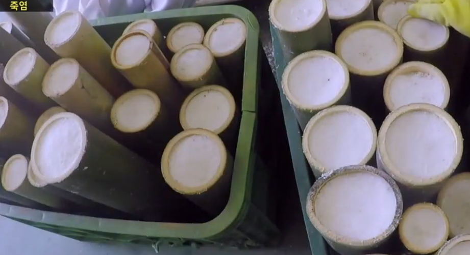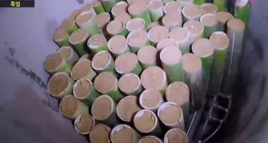 먼저 경상남도 함양군에 위치한 한 죽염 공장에서는, ‘쿵쿵’ 소리를 따라가면 잘게 분쇄된 천일염을 대나무 속에 분주하게 채워 넣는 작업을 볼 수 있습니다. 단단한 소금 기둥을 만드는 것이 중요하기 때문에 작업자들은 대나무를 바닥에 내리치며 작업을 하고, 연이어 쿵쿵 소리가 나게 됩니다. 하루에 사용되는 소금의 양만 해도 무려 8t이며, 이 작업으로 인해 온몸이 욱신거리기 일쑤라고 합니다.