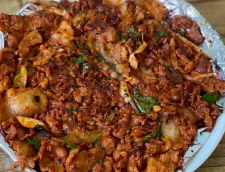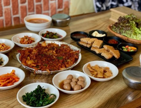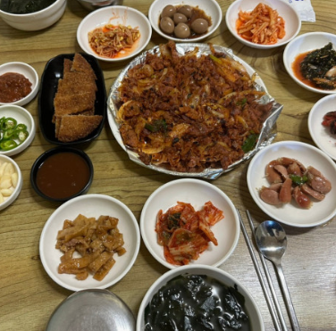 생선까스와 함께 나오는 쌈을 쌈장, 마늘, 청량고추와 함께 먹으면 그 맛이 일품입니다. 또한 미역국에는 예상치 못한 소고기가 들어 있어 맛이 더욱 풍부했습니다. 집에서 어머니가 해주시는 밥처럼 정겨운 맛이 나는 식사라고 합니다 식당의 특별 메뉴 중 하나인 연탄석쇠구이는 제육볶음용 돼지고기를 양파와 다양한 야채와 함께 석쇠에 바싹 구워내어, 고기 사이에 배인 불향이 매력적인 요리입니다.