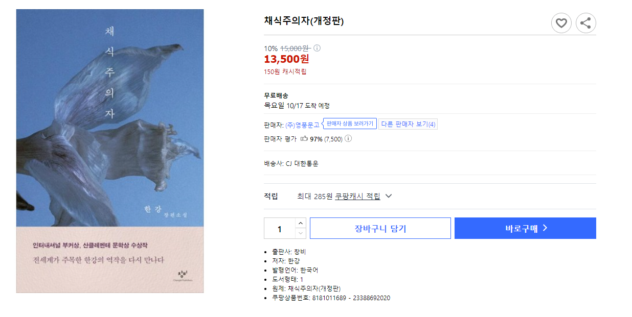 얼마전 소설가 한강 작가의 노벨문학상 소식이 전해지면서 한강 열풍이 불고 있습니다 한강 채식주의자 책 구매 구입 전자책 e북 txt pdf 다운로드 아래를 통해서 주문하시기 바랍니다
